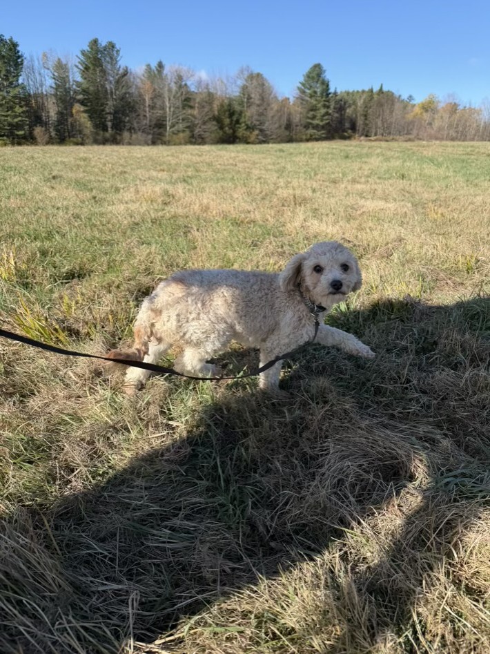 Havapoo roux et blanc dans l'herbe